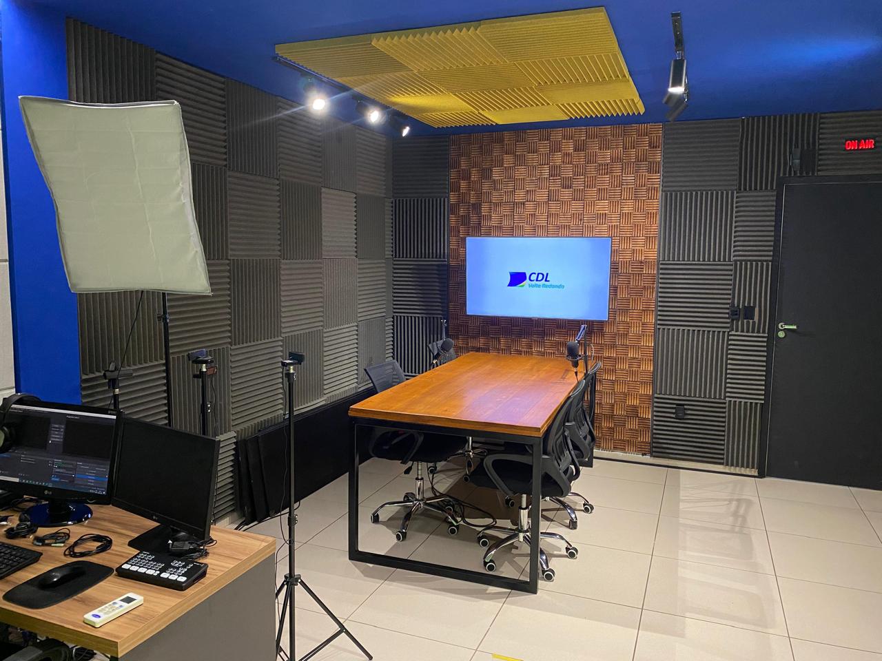 Espaço moderno e equipado, com capacidade máxima para até 7 pessoas. Ideal para gravações, podcasts e produções audiovisuais.